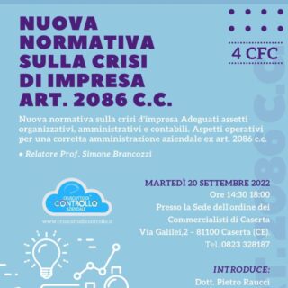 Convegno martedì 20 settembre h14.30-18, #4CFC ! 𝗡𝗨𝗢𝗩𝗔 𝗡𝗢𝗥𝗠𝗔𝗧𝗜𝗩𝗔 𝗦𝗨𝗟𝗟𝗔 𝗖𝗥𝗜𝗦𝗜 𝗗𝗜 𝗜𝗠𝗣𝗥𝗘𝗦𝗔 𝗔𝗥𝗧. 𝟮𝟬𝟴𝟲 𝗖.𝗖. Presso sede dell’Ordine dei Dottori Commercialisti di #CASERTA Nuova normativa sulla crisi d’impresa Adeguati assetti organizzativi, amministrativi e...