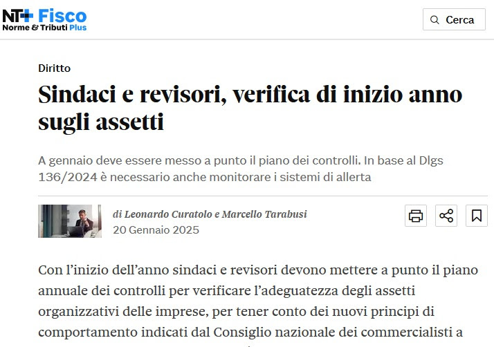 Buongiorno, l’articolo del 20 gennaio sul Sole24Ore campeggia che con l’inizio dell’anno sindaci e revisori devono mettere a punto il piano annuale dei controlli per verificare l’adeguatezza degli assetti organizzativi delle imprese, per tener conto dei nuovi principi di comportamento indicati dal Consiglio nazionale dei commercialisti a dicembre che recepiscono le novità introdotte al correttivo-ter al Codice della crisi.