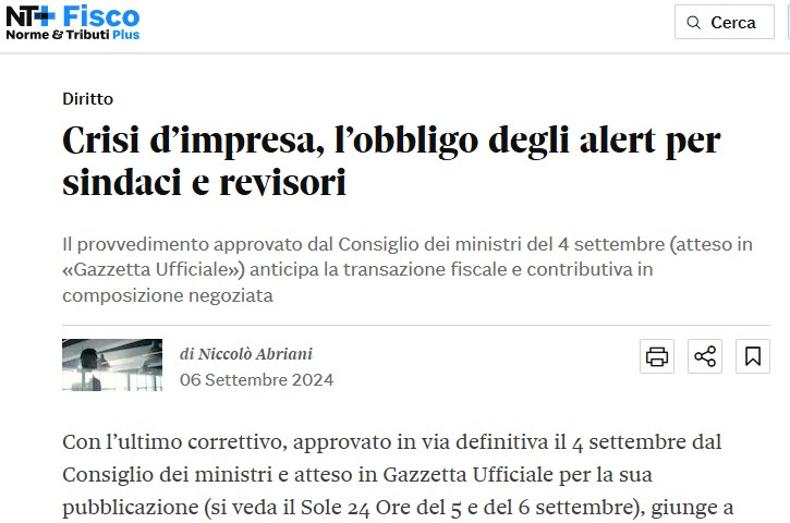 Nell’articolo del Sole24Ore “Crisi d’impresa, l’obbligo degli alert per sindaci e revisori” del 6 settembre 2024 (ecco il link: https://ntplusfisco.ilsole24ore.com/art/crisi-d-impresa-l-obbigo-alert-sindaci-e-revisori-AFaI5NlD?cmpid ) si evince che da più di 1 anno i revisori hanno l’obbligo di vigilare e se non lo fanno pagano di tasca propria.